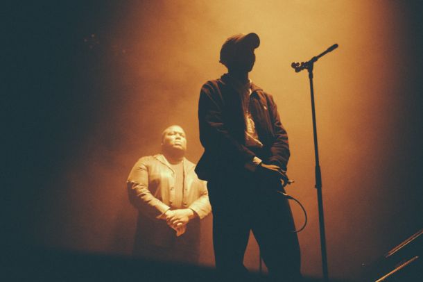 Intervalo a pensar como poderia Dean Blunt superar aquelas duas viagens, pouco depois da meia-noite, blackout total. Luzes apagadas, cabras-cegas mentais com um acender de isqueiro ali e acolá no palco, um “parece que está ali alguém”, “agora parece que está ali do outro lado”. Som de água a correr, piano. Luz ténue, e surge um senhor que parece um guarda-costas de um clube qualquer. Mas não é um clube qualquer, é a elite da música britânica, um adereço humano de um mago performer que já tinha encantado há meses o Maria Matos. Ao contrário do seu guarda-costas cénico, Dean tem aspecto de “Faithless”, magro, boné Nike, cheiro a erva do charro que só podia ser dele – cheiro a erva na CUF parecia mesmo 1974!. Mas graças a Dean Blunt parecia mesmo era 2014. Entre The Redeemer, um dos discos do ano passado, e o seu novo que está para sair, Dean, com o “bouncer que nunca se mexeu um centímetro”, a miúda dos coros, ópera e guitarra etérea, e o saxofonista que devia ser o “men” que estava no escuro mesmo ao pé de nós, deu-nos uma espectáculo para mais tarde recordar, a contar desde as primeiras horas de sábado até sempre. Ainda houve a escuridão a tomar conta da sala de novo, mas desta vez com holofotes OVNI a piscar na cara, mesmo no momento em que eu sonhava que via os A R Kane ao vivo com o Tricky. É toda uma dificuldade de o classificar que o torna maravilhosamente inclassificável, trip hop com saxofone, shoegazer com hip hop, ópera com funk, mescla sonora escura e ao mesmo tempo iluminada, de qualidades hipnóticas tais, que quando se fez luz de novo na sala e já não havia ninguém no palco, parecia-me que tinha passado a vida inteira ali num flash.