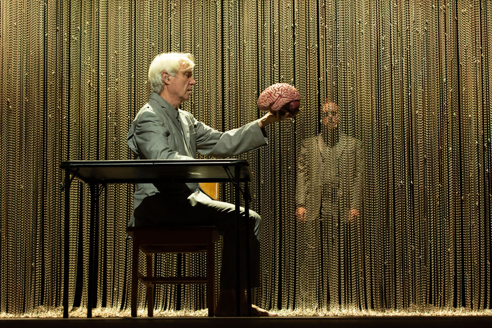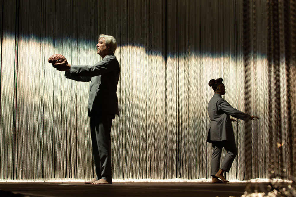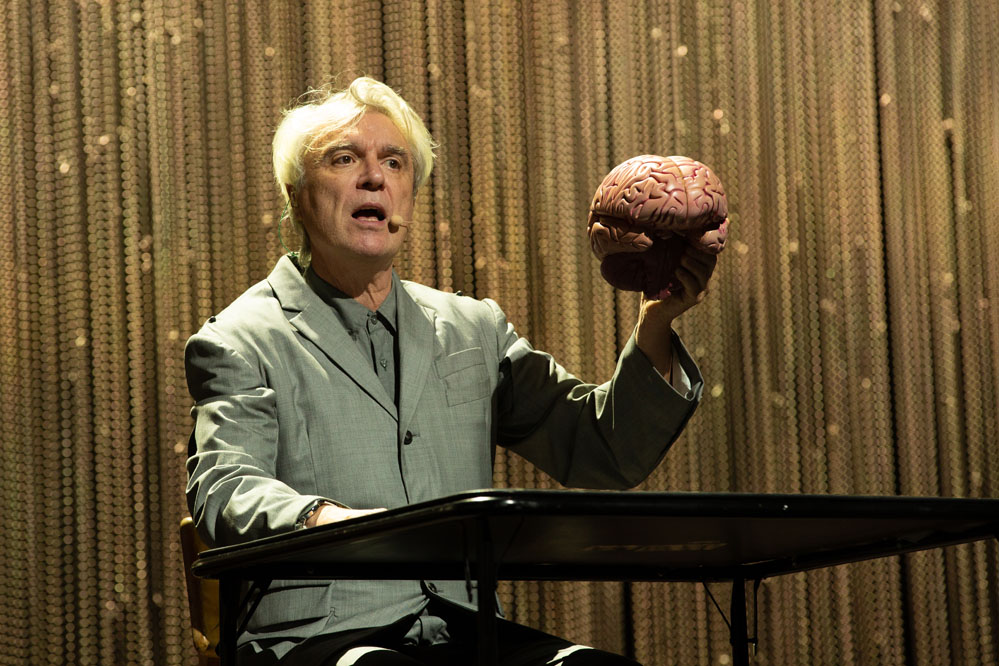 O palco foi montado num hipódromo e foi Byrne quem abriu o chamado EDP Cool Jazz (nem vamos entrar por aí, já nem vamos à procura do jazz, essa conversa fica para outra altura…). O público encheu o recinto, ouviu-se falar em oito mil pessoas, sendo sobretudo constituído por pessoas de meia-idade. Muitos foram motivados pela música (sobretudo, e naturalmente, a evocação dos Heads), e também pelo saudosismo, pela ideia de voltar à juventude assistindo à actuação de um cantor pop-rock de 66 anos. O concerto abriu com “Here”, tema que fecha o disco recente (co-produzida por Daniel Lopatin AKA Oneohtrix Point Never), mostrando desde logo a enorme aposta na encenação: Byrne ao centro do palco, apontado num cérebro de plástico para diferentes zonas (“Here is many sounds / for your brain to comprehend / here the sound is organised / into things that make some sense”). O mote estava dado, Byrne e a banda iam enviando sons, os nossos cérebros ia tentar processá-los.
